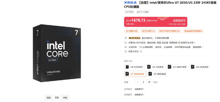 不过,《战地6》这款游戏还是比较吃CPU性能的,如果想要特效全开,个人建议直接上目前最有性价比的热门CPU——Intel 酷睿 Ultra 7 265KF。因为它的价格也跟着这次的双11购物狂欢节来到了历史新低。比如天猫某电商给出的价格居然是盒装版16XX元,你说性价比是不是直接拉满?